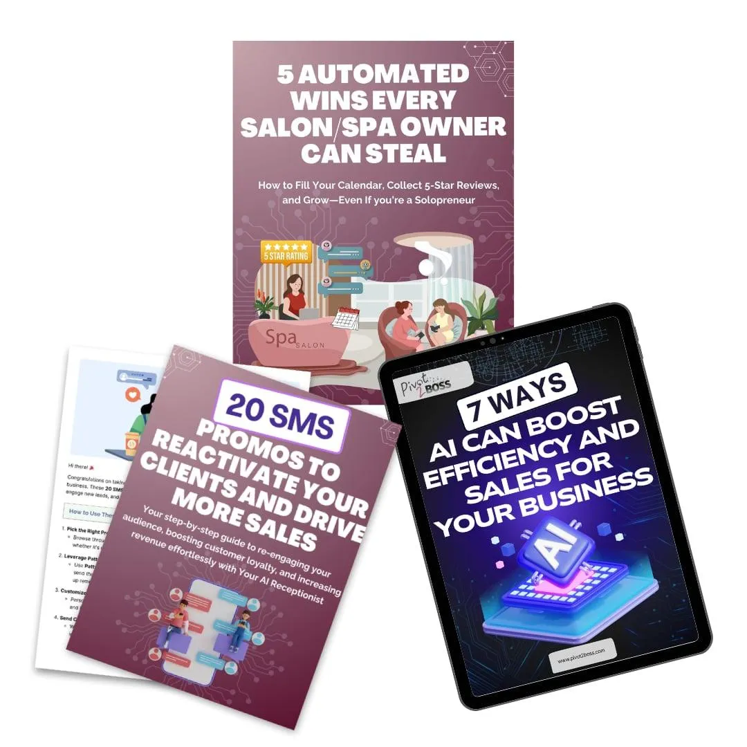 Unlock the full potential of your salon or spa business with our exclusive freebies designed to save you time, boost sales, and streamline your operations — all at no cost to you. These resources are crafted specifically for salon and spa owners who want to reactivate clients, increase efficiency, and automate key business processes effortlessly.